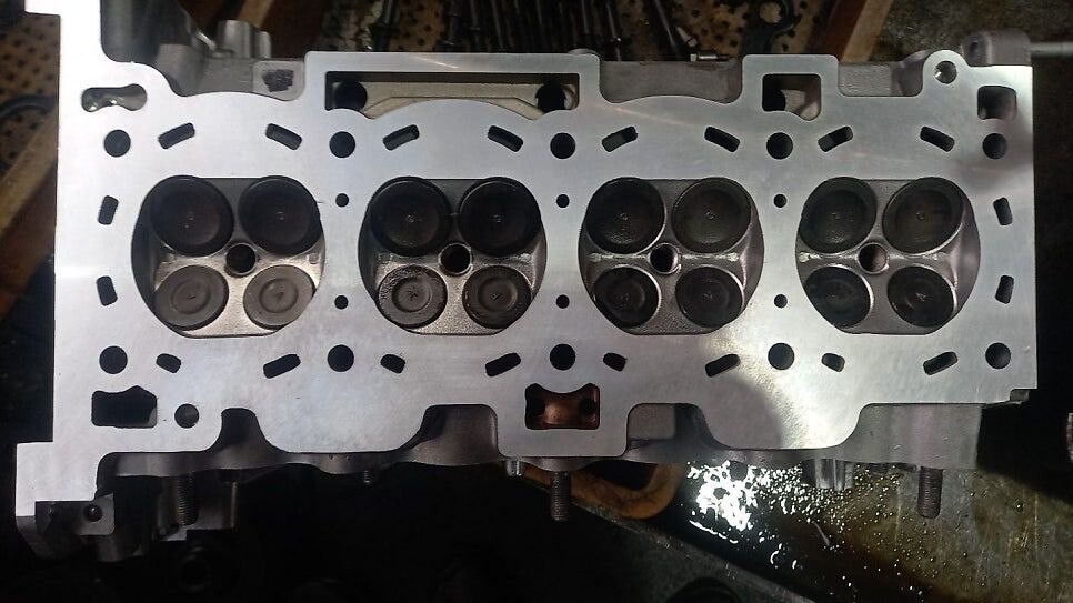 Фрезеровка плоскости при короблении, обслуживание направляющих и сёдел, притирка/замена клапанов по состоянию, замена маслосъёмных колпачков. Промываем маслоканалы, оцениваем элементы CVVT/OCV (по показаниям), чтобы стабилизировать фазы после капиталки. При капремонте G4KE всегда меняем цепь ГРМ — независимо от визуального состояния. Это страховка от повторного визита через 20 000 км.