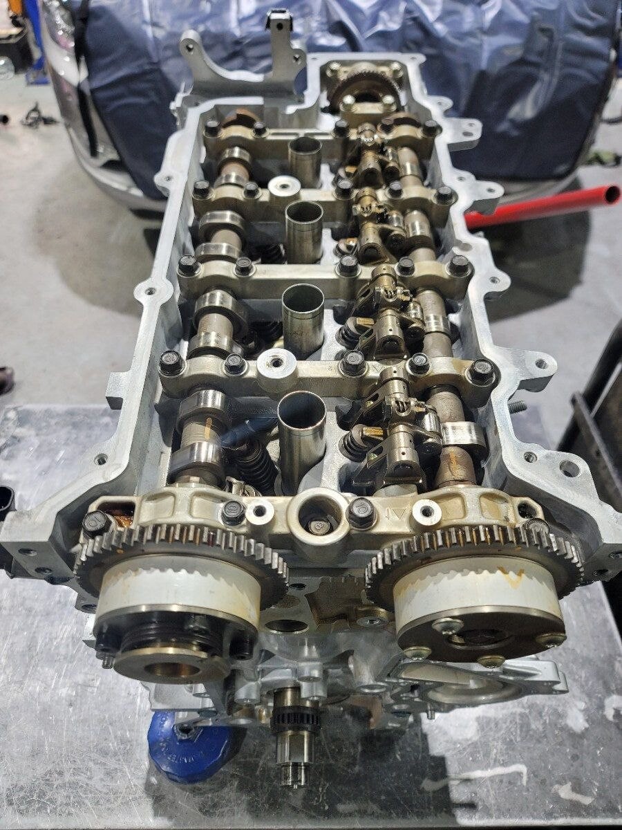 оцениваем ГБЦ: плоскость, направляющие/клапаны, состояние распредвалов; диагностируем элементы ГРМ (цепь, натяжитель, башмаки) и фазорегуляторы (CVVT).